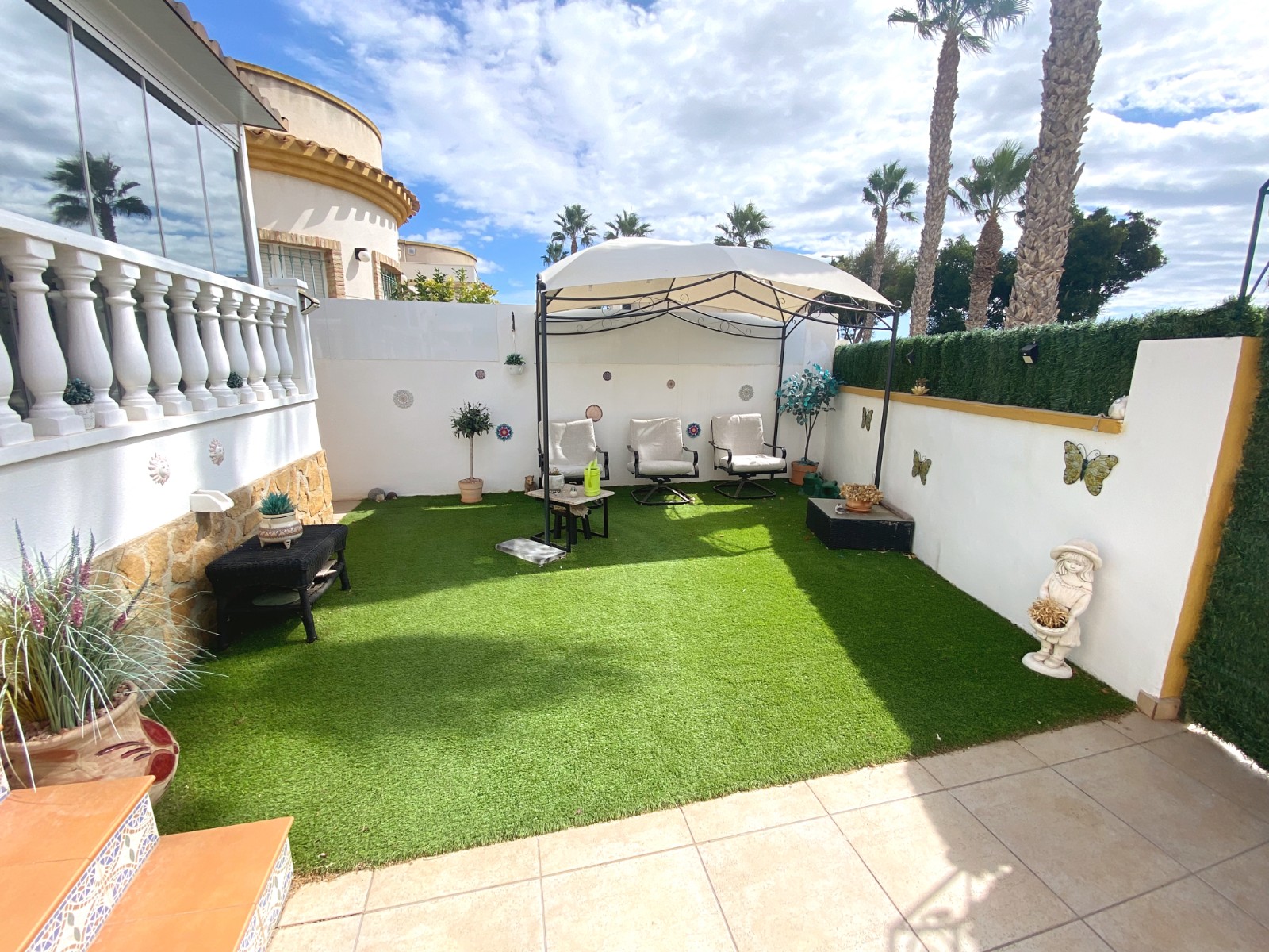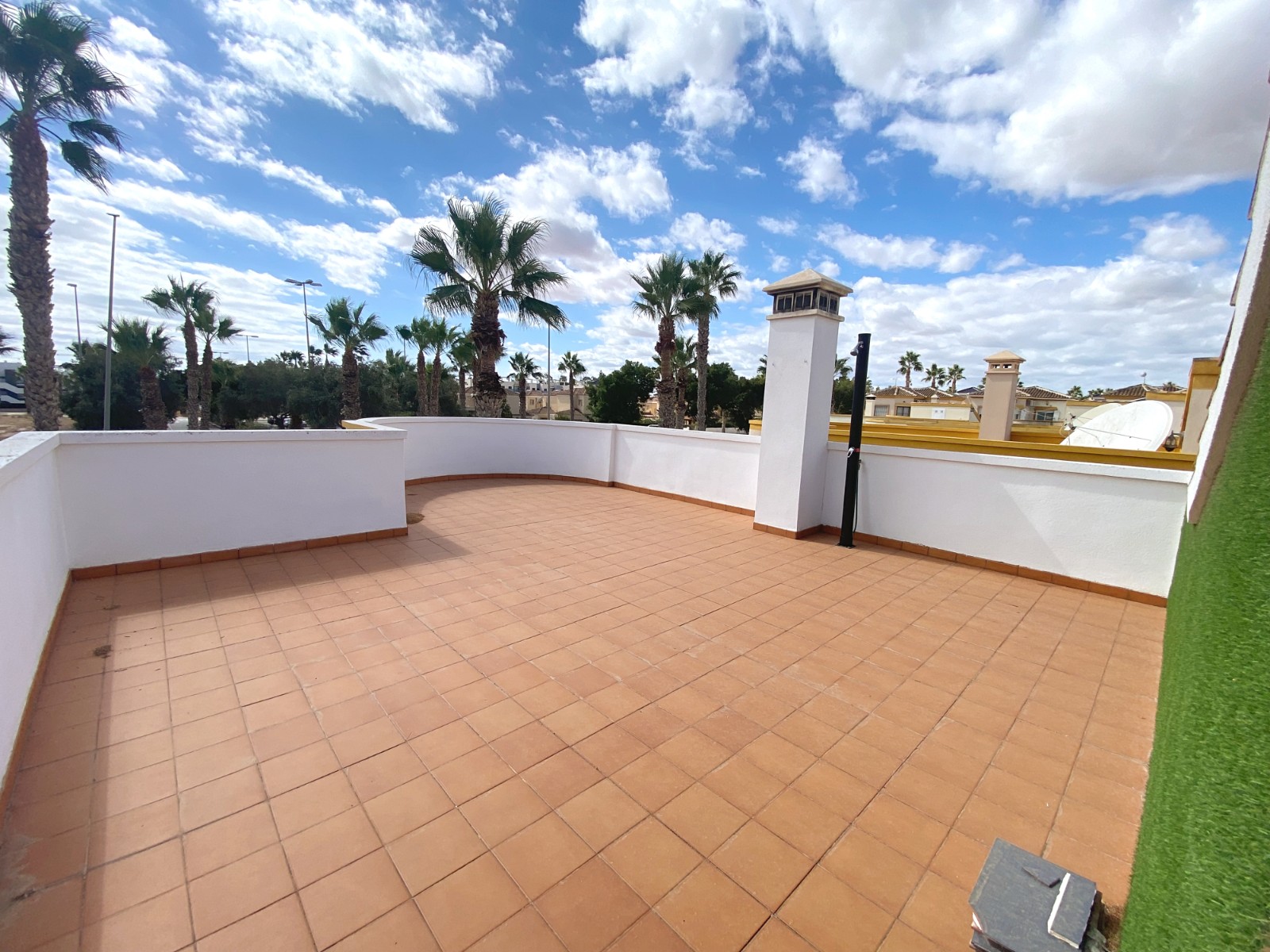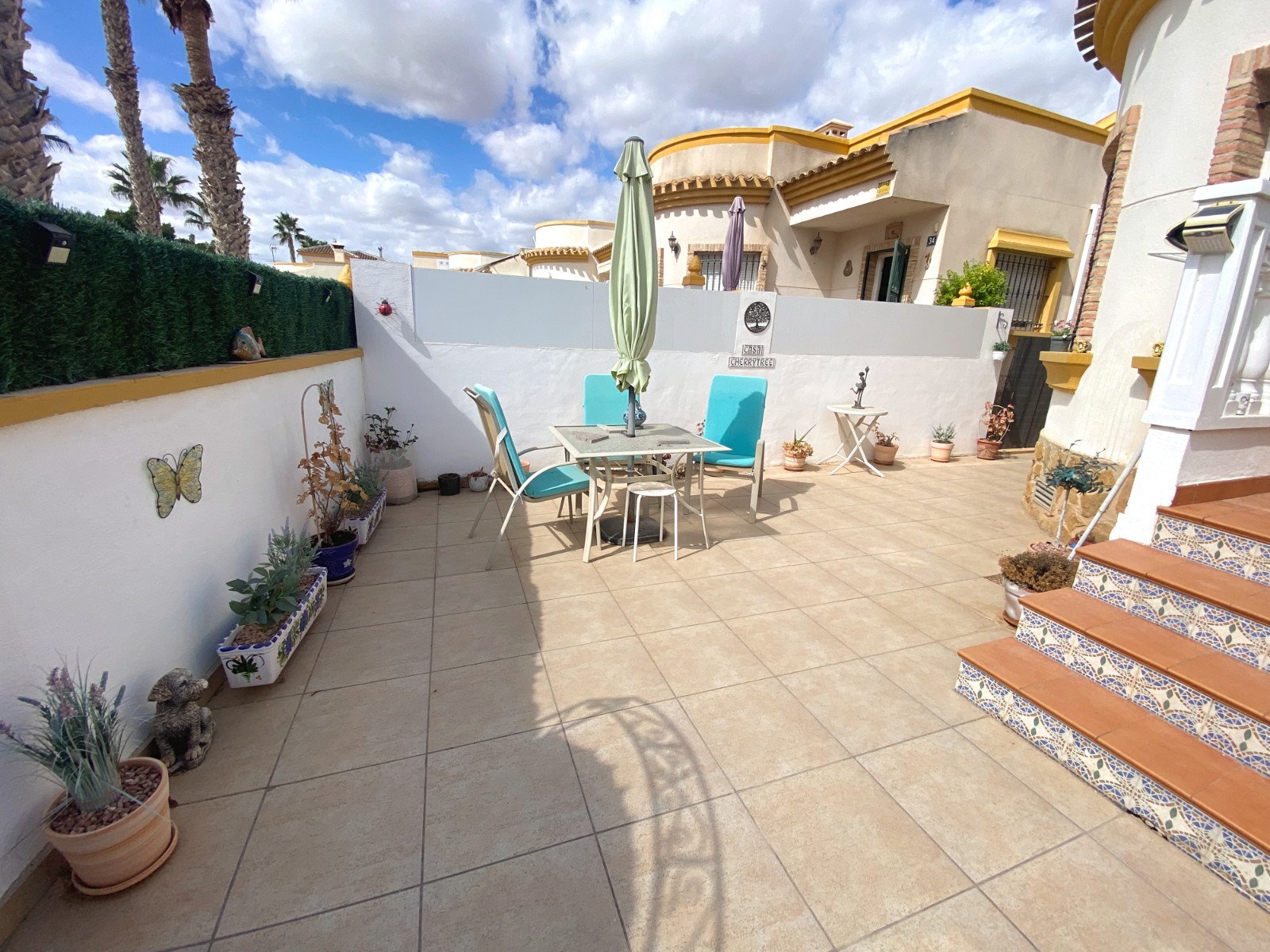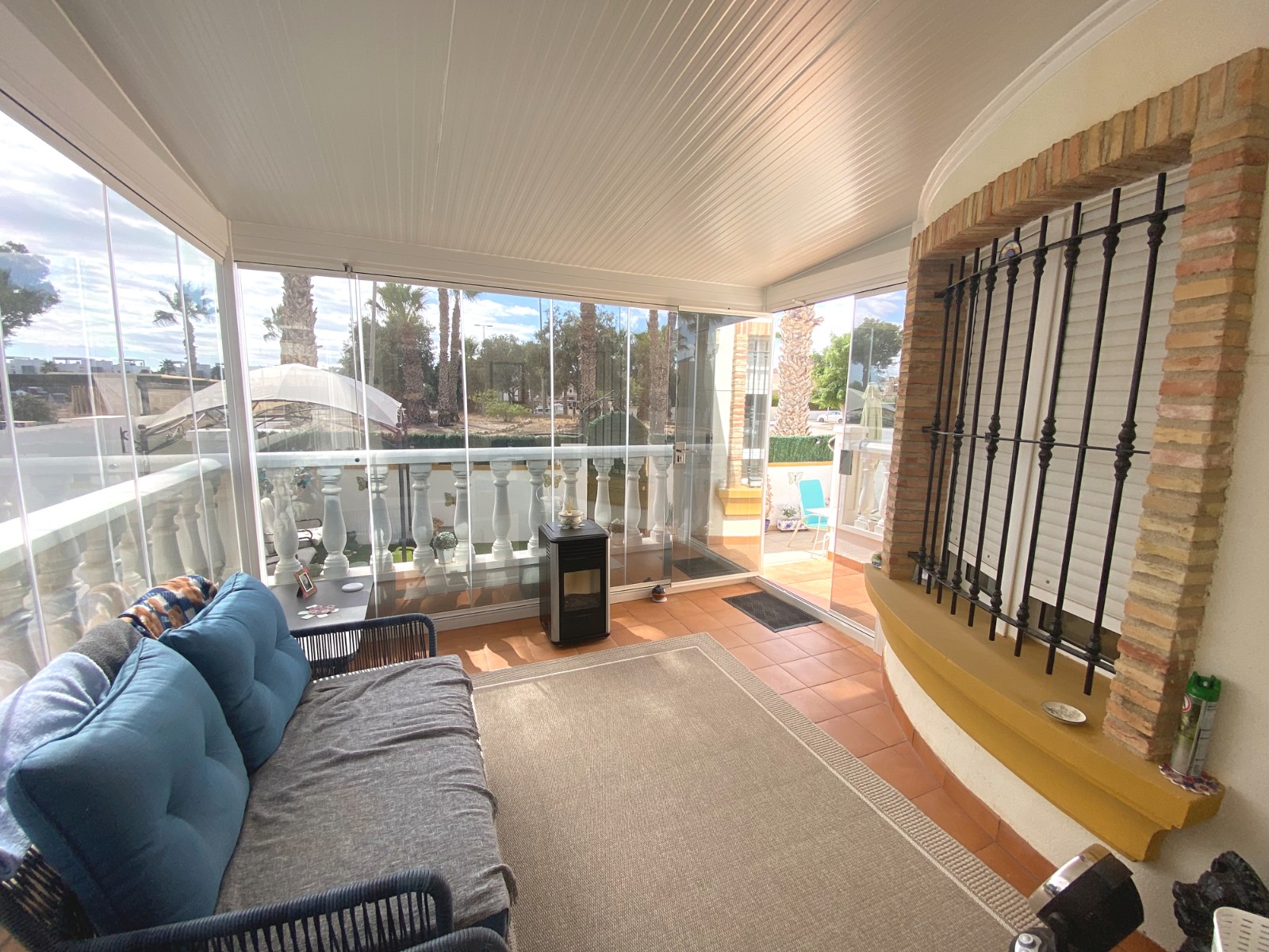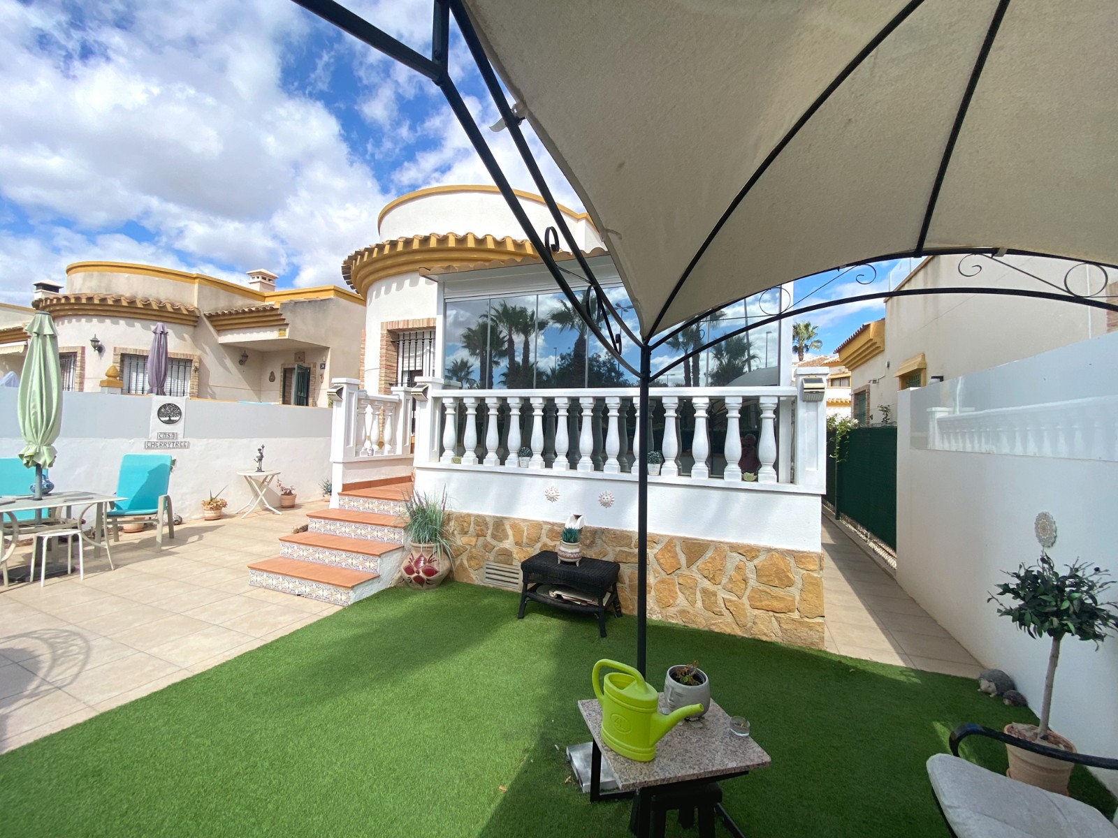 This superb detached villa is presented for sale in excellent condition and has been maintained to a very high standard. The property offers a bright spacious two bedroom, one bathroom accommodation with a large lounge / diner and a feature fire place. A good size fully equipped kitchen complete with open breakfast bar area. An archway from the dining area leads to a passageway to two double bedrooms and a family size bathroom. The property has a large glazed, private front terrace feature Currently used as a beautiful sun lounge taking full advantage of its south facing aspect. To the front of the property is a good size garden area that has great potential and/or private splash pool. To the rear of the property is an of road drive and gates storage areas and a staircase that leads up to a very large roof terrace. From this terrace there are excellent views of the local area and over the large green area to the front of the property. There is a very large storage area on the roof space that also has great potential. Viewing is highly recommended to really appreciate what this property has on offer.
